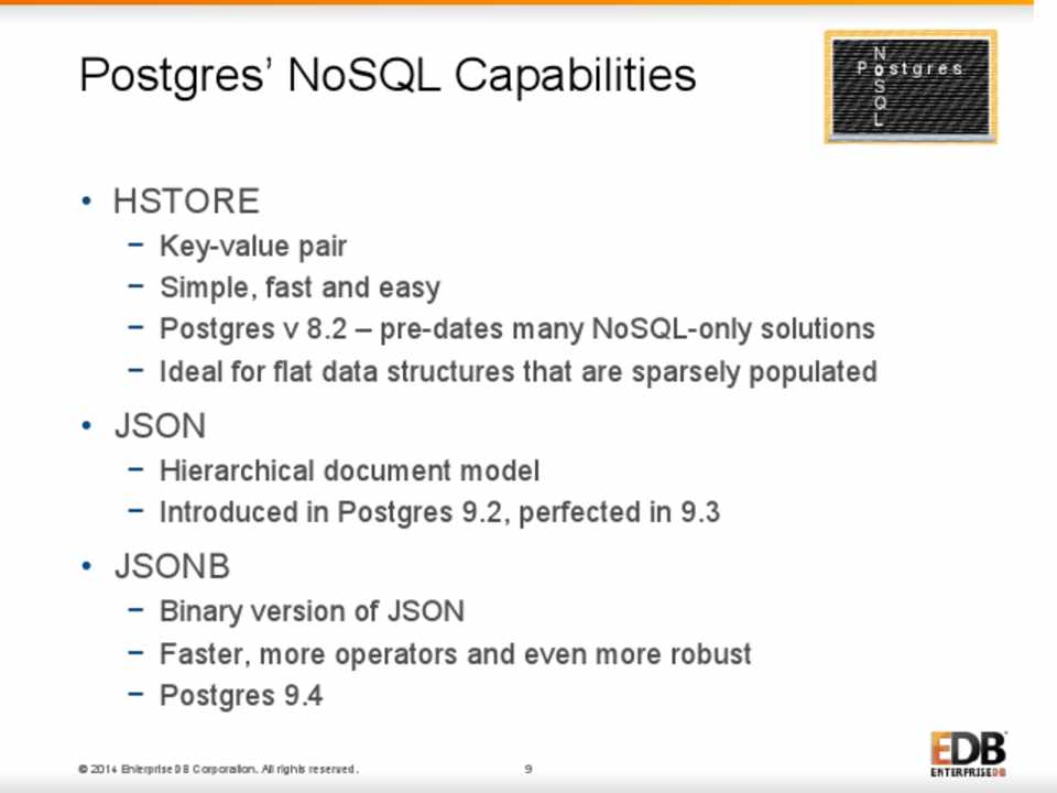 − Hierarchical document model − Introduced in Postgres 9.2, perfected in 9.3