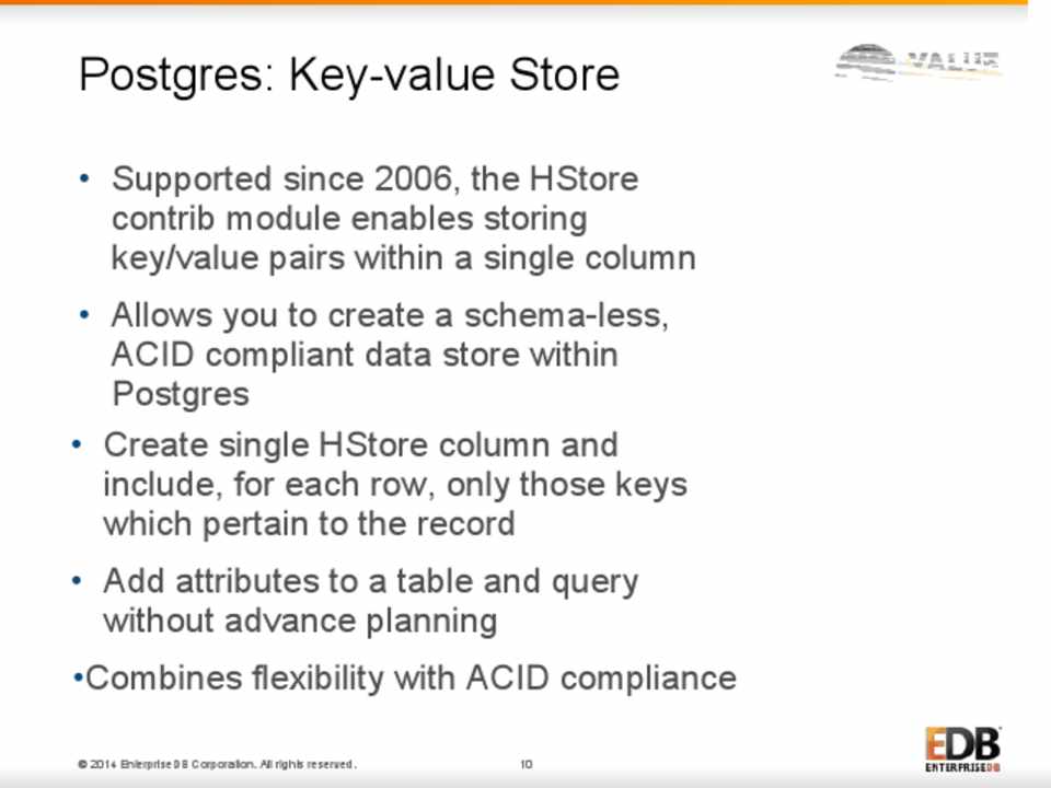 − Key-value pair − Simple, fast and easy − Postgres v 8.2 – pre-dates many NoSQL-only solutions − Ideal for flat data structures that are sparsely populated