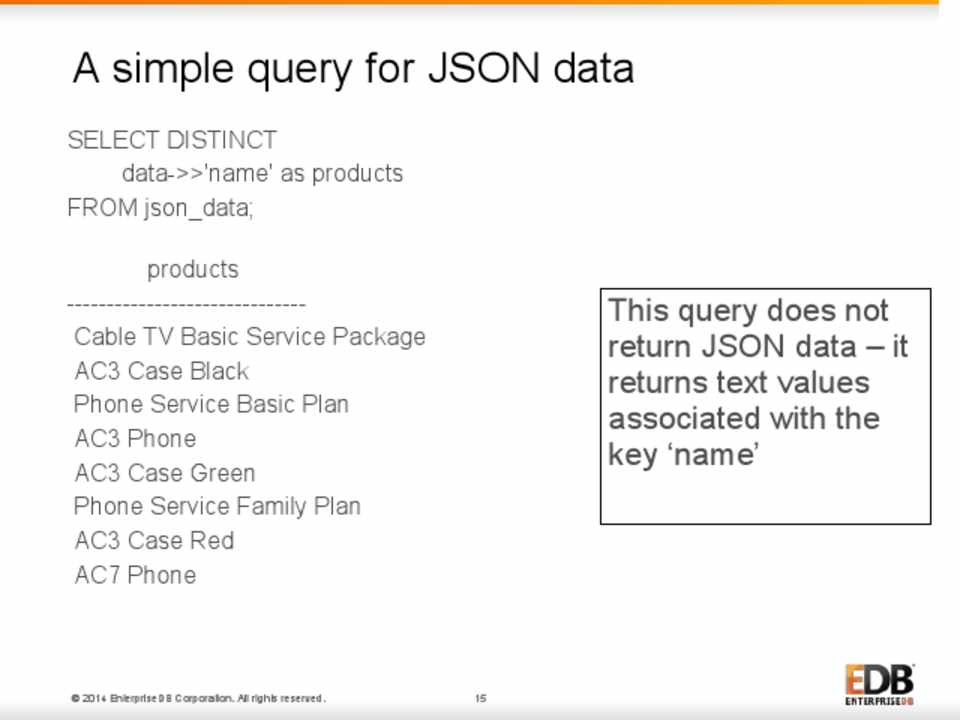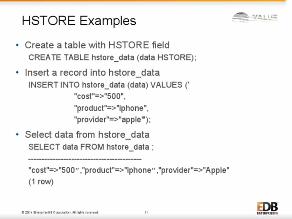 SELECT data FROM hstore_data ; -----------------------------------------"cost"=>"500”,"product"=>"iphone”,"provider"=>"Apple" (1 row)