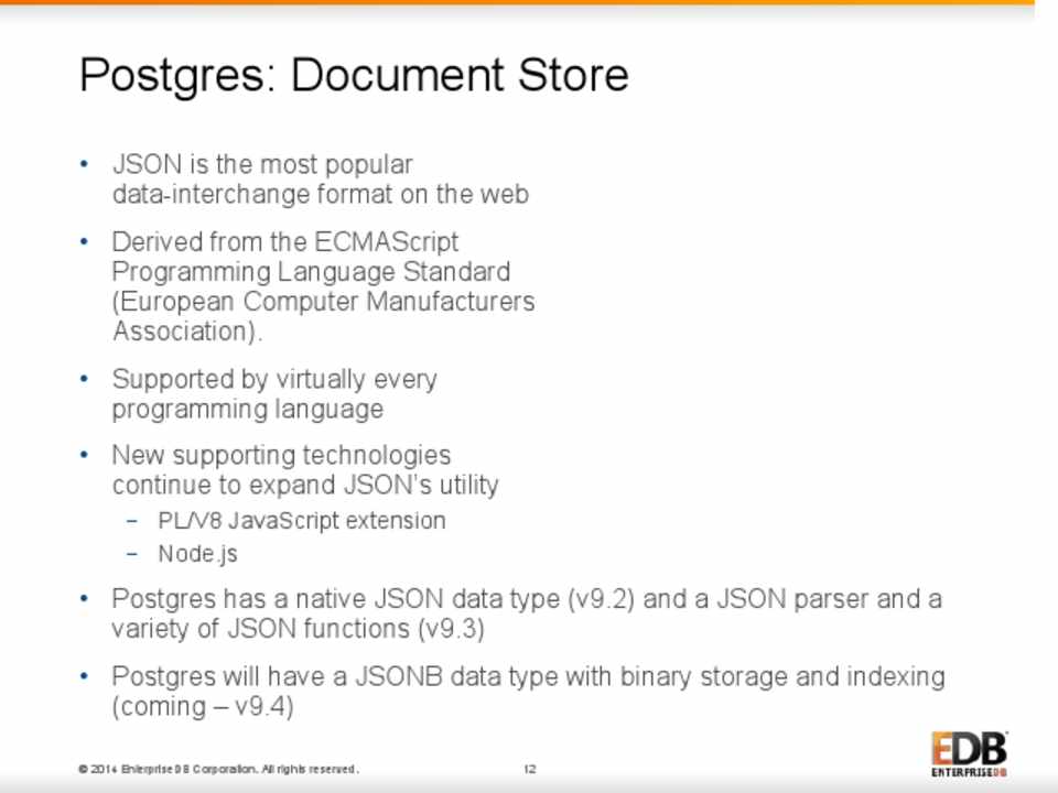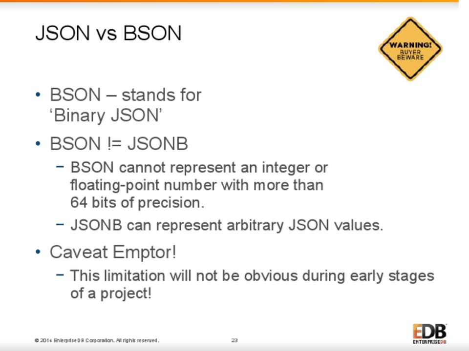 • Postgres will have a JSONB data type with binary storage and indexing (coming – v9.4)