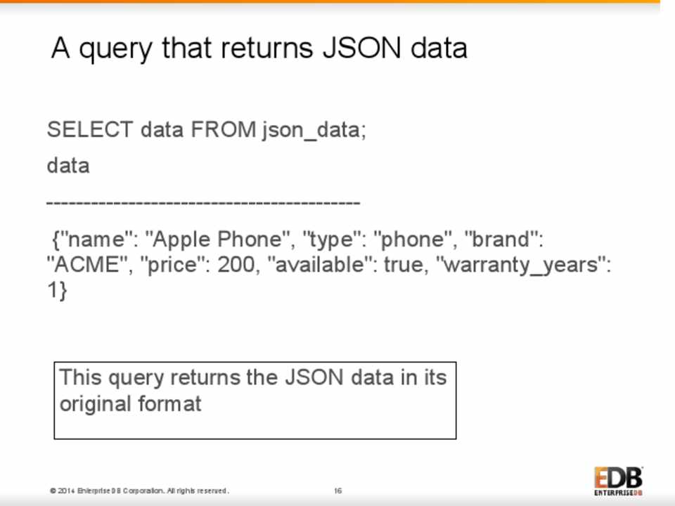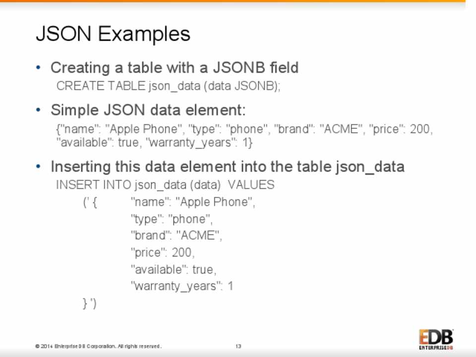 INSERT INTO json_data (data) VALUES (’ { "name": "Apple Phone", "type": "phone", "brand": "ACME", "price": 200, "available": true, "warranty_years": 1 } ')