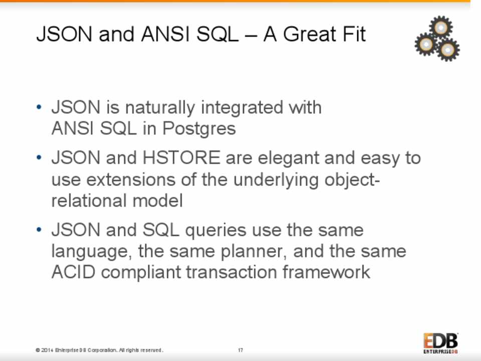 − Combines structured data and unstructured data (ANSI SQL and JSON/HSTORE)