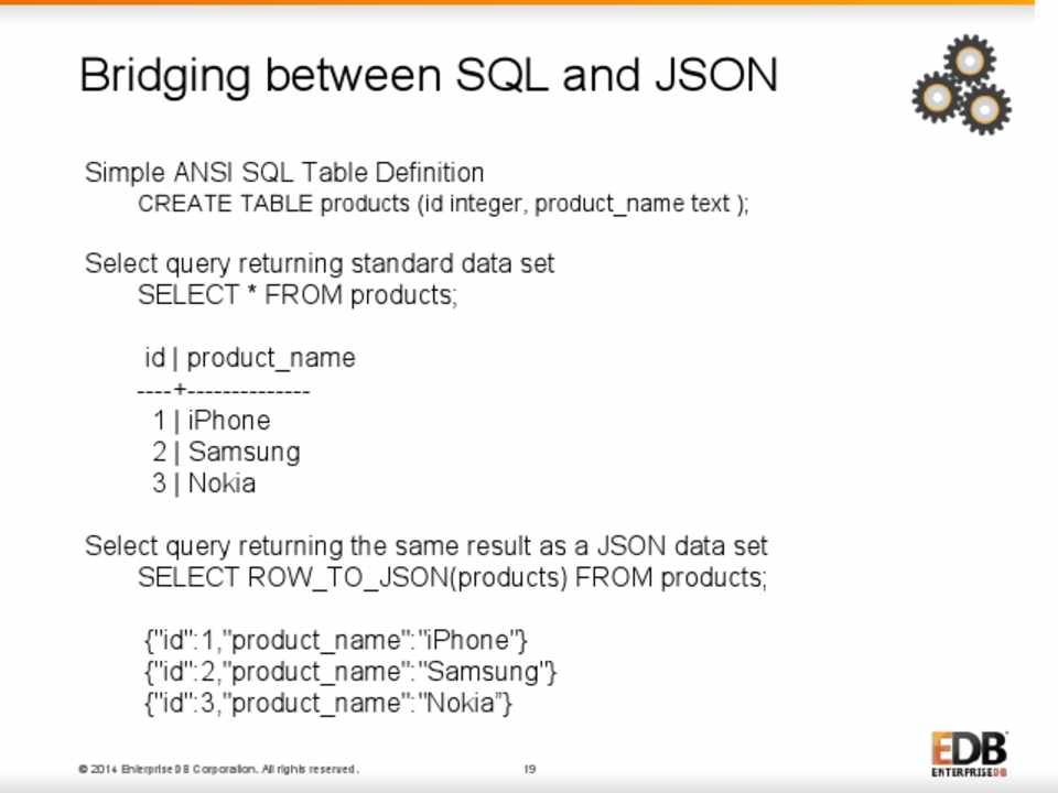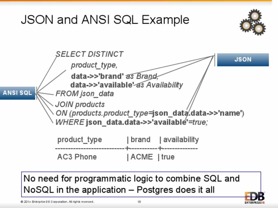 − NoSQL Document data store − Full support for JSON document functions and operators − Embed JSON in your SQL − Easy bi-directional interchange of JSON and relational data