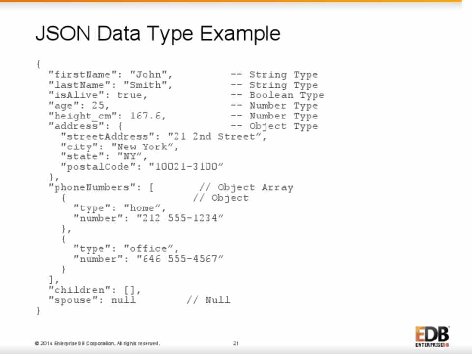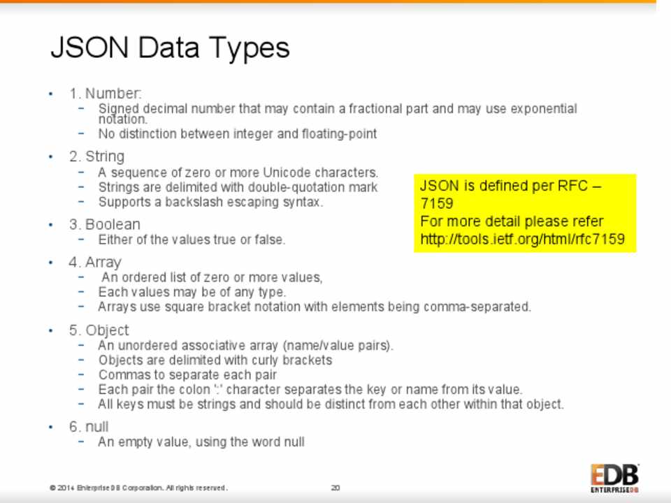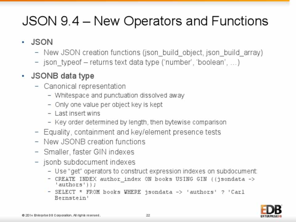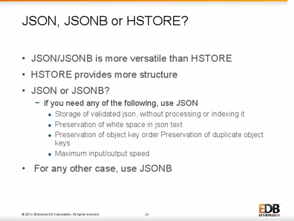 − Binary version of JSON − Faster, more operators and even more robust − Postgres 9.4
