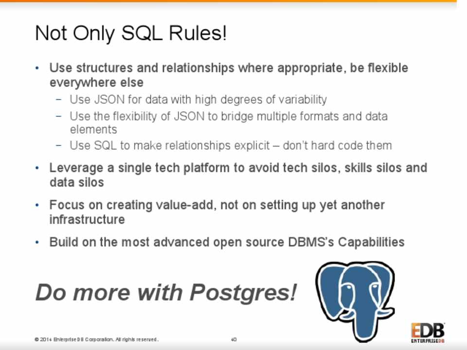 • Postgres overcomes many of the standard objections “It can’t be done with a conventional database system”
