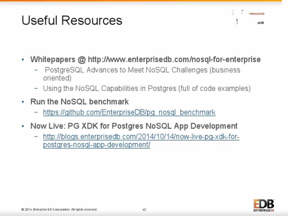 • Whitepapers @ http://www.enterprisedb.com/nosql-for-enterprise