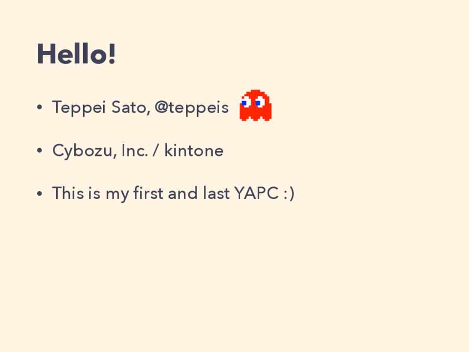 • Teppei Sato, @teppeis • Cybozu, Inc. / kintone • This is my first and last YAPC :)