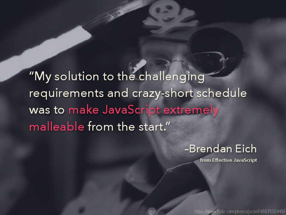 “My solution to the challenging requirements and crazy-short schedule was to make JavaScript extremely malleable from the start.”
