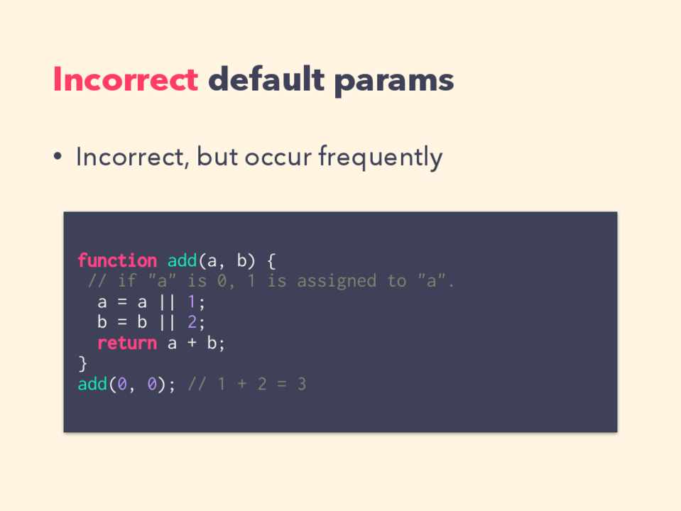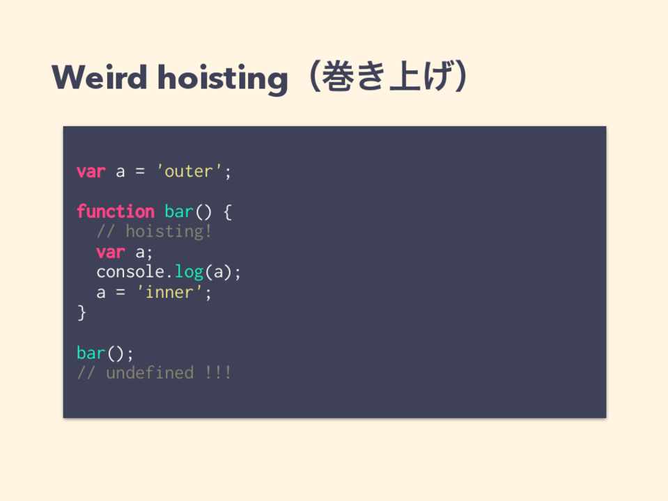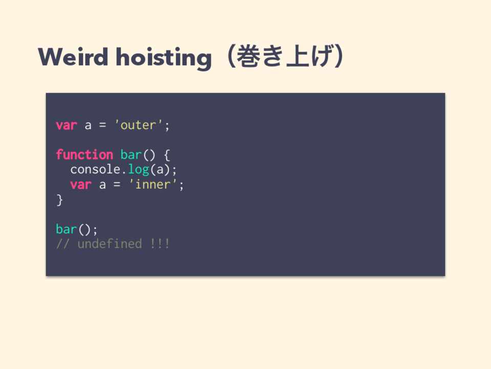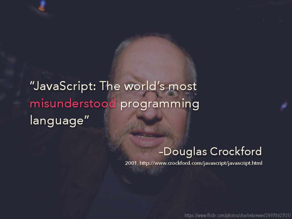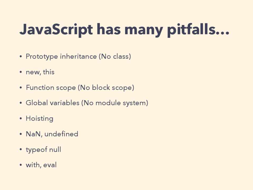 • Prototype inheritance (No class) • new, this • Function scope (No block scope) • Global variables (No module system) • Hoisting • NaN, undefined • typeof null • with, eval
