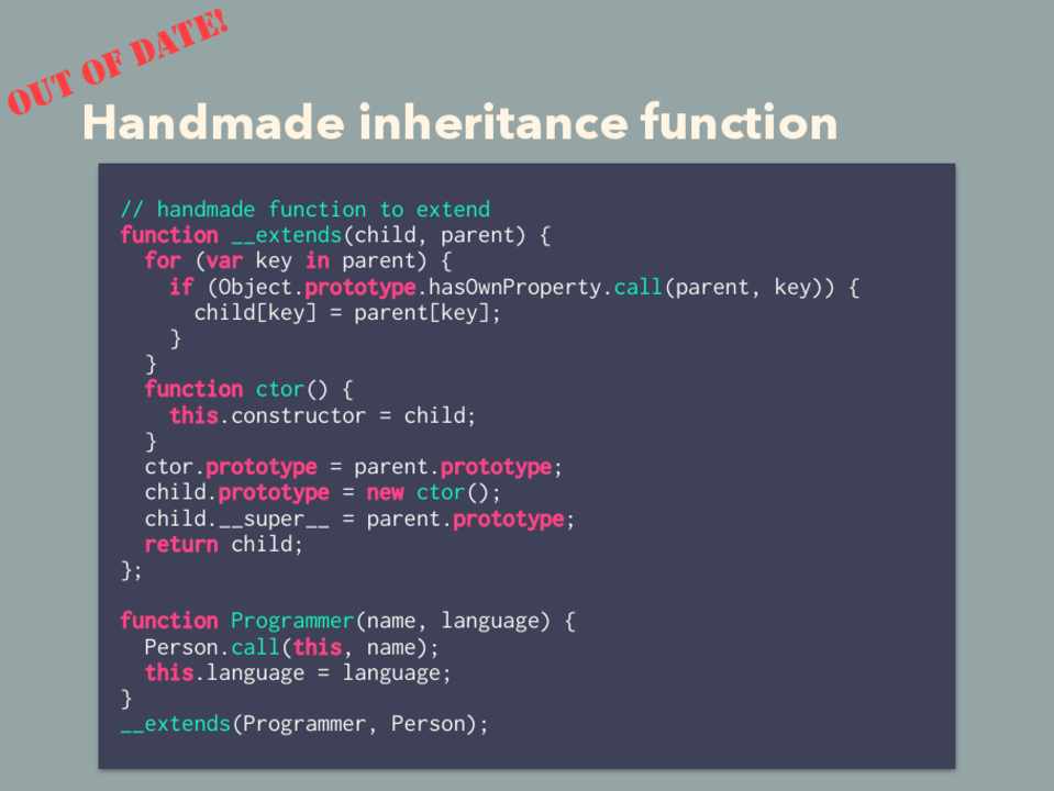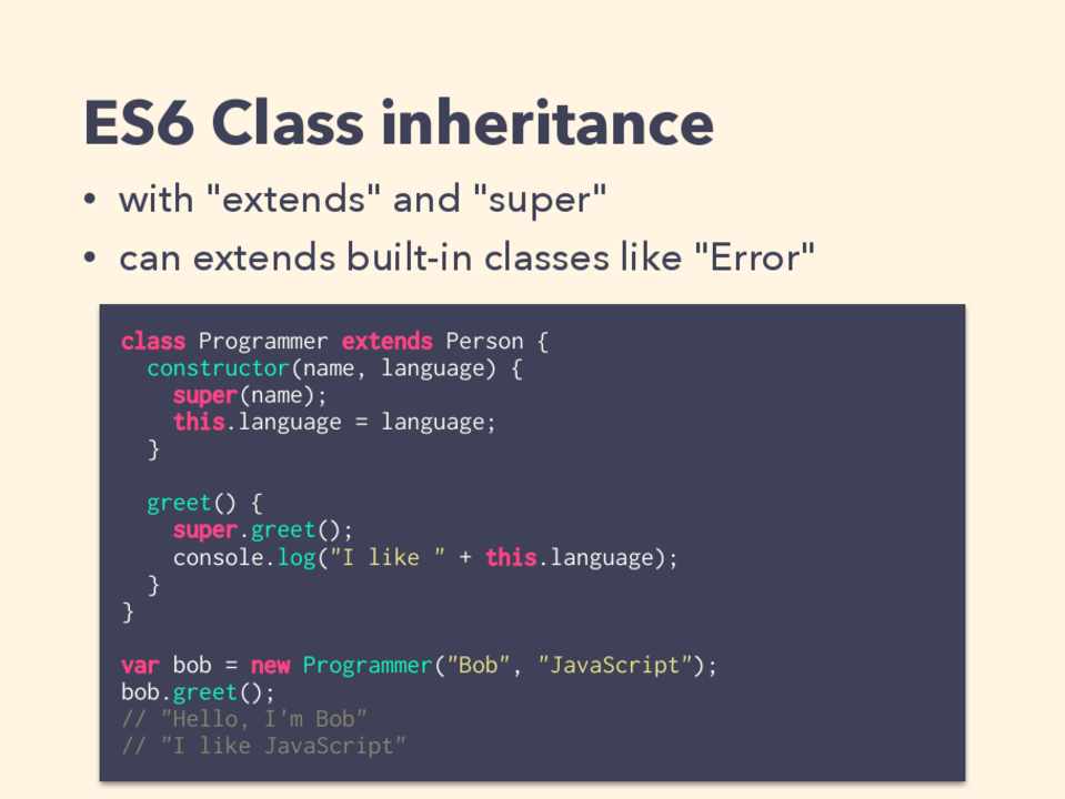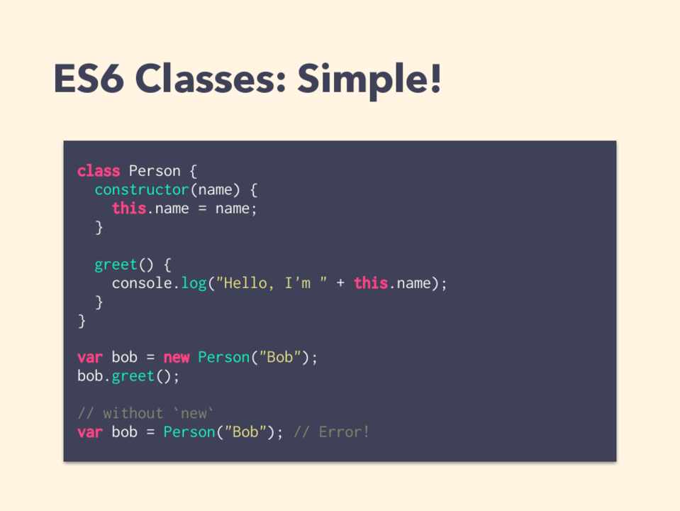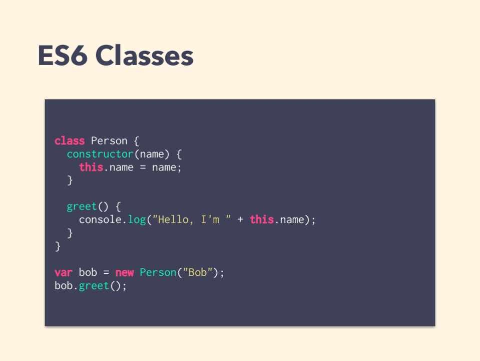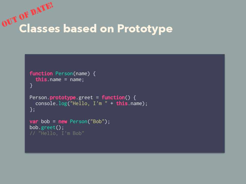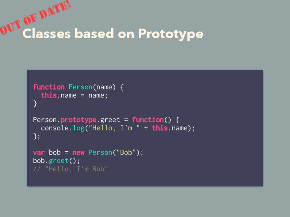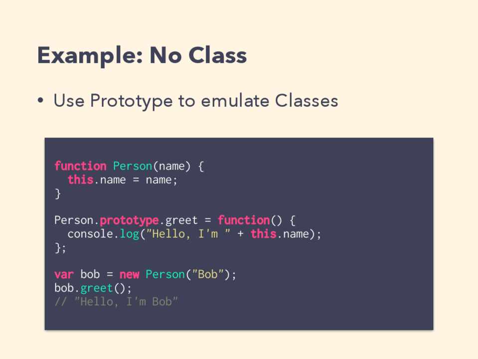 console.log("Hello, I'm " + this.name); }; var bob = new Person("Bob"); bob.greet(); // "Hello, I'm Bob"