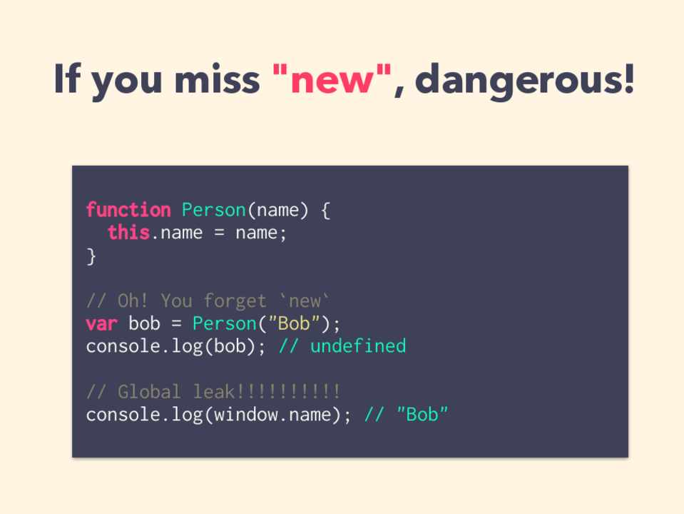 } // without `new` var bob = Person("Bob"); bob.greet(); // "Hello, I'm Bob"