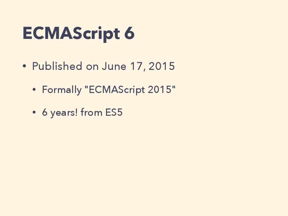 • Formally "ECMAScript 2015" • 6 years! from ES5