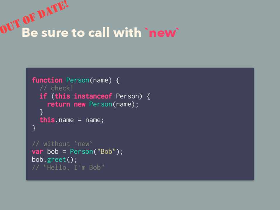 function Person(name) { // check! if (this instanceof Person) { return new Person(name); } this.name = name;
