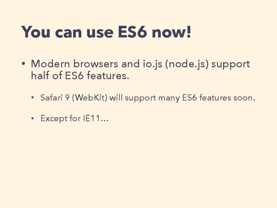 • Safari 9 (WebKit) will support many ES6 features soon. • Except for IE11…