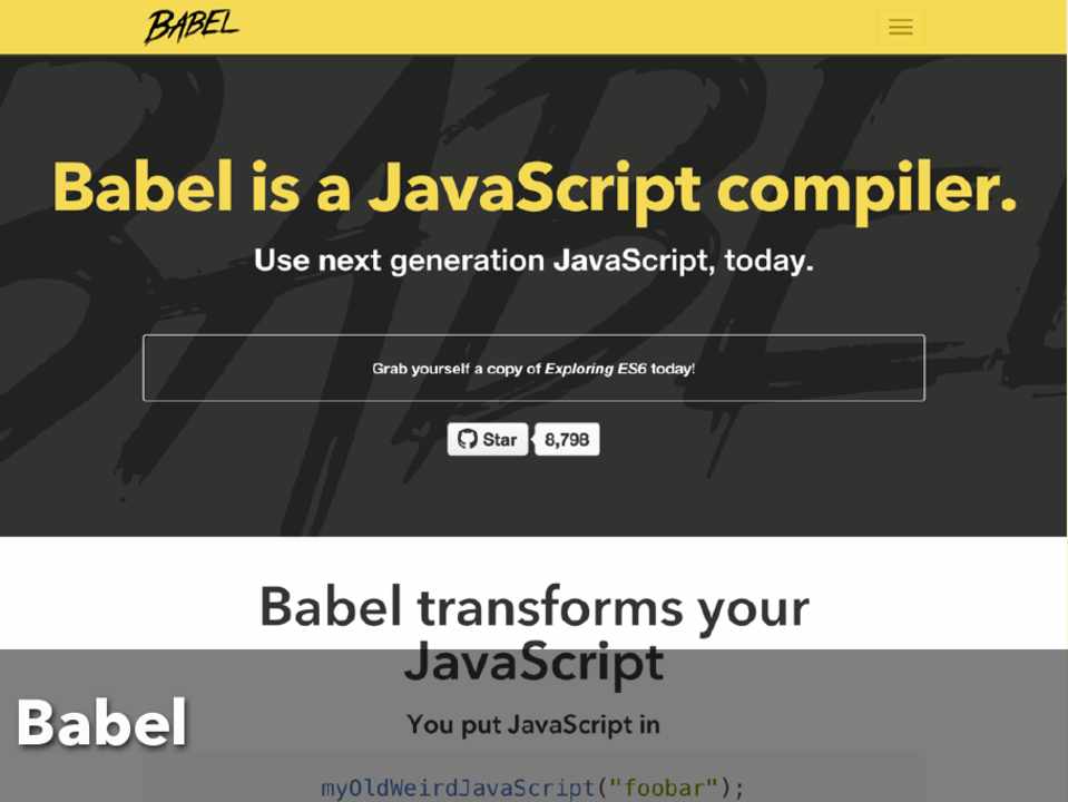 • The most compatible (71%) ES6 transpiler • Integrated with core-js (polyfill library) • Usage: