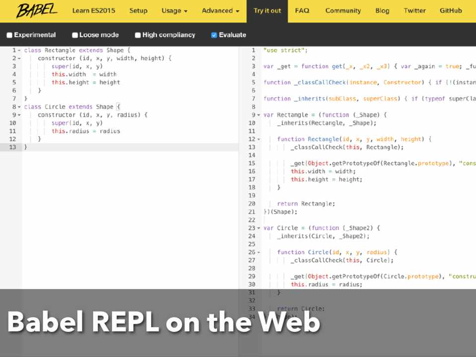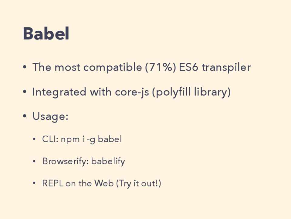 • CLI: npm i -g babel • Browserify: babelify • REPL on the Web (Try it out!)