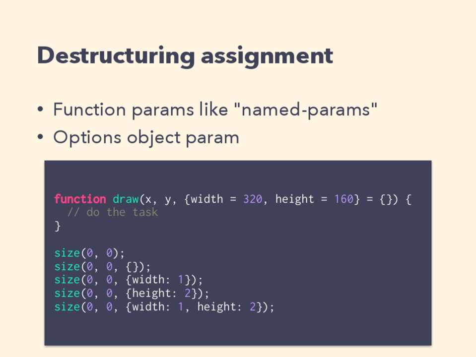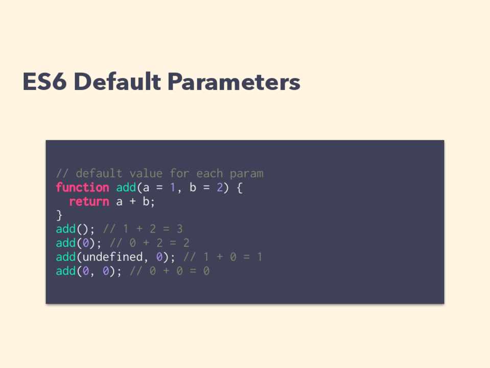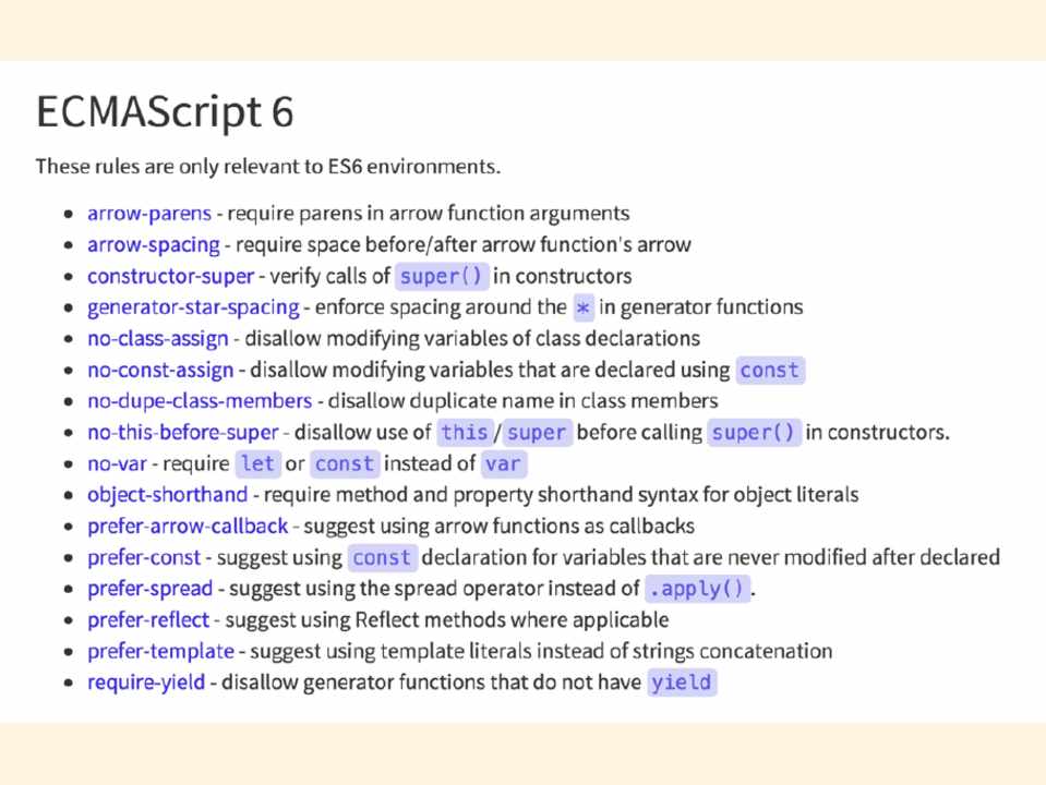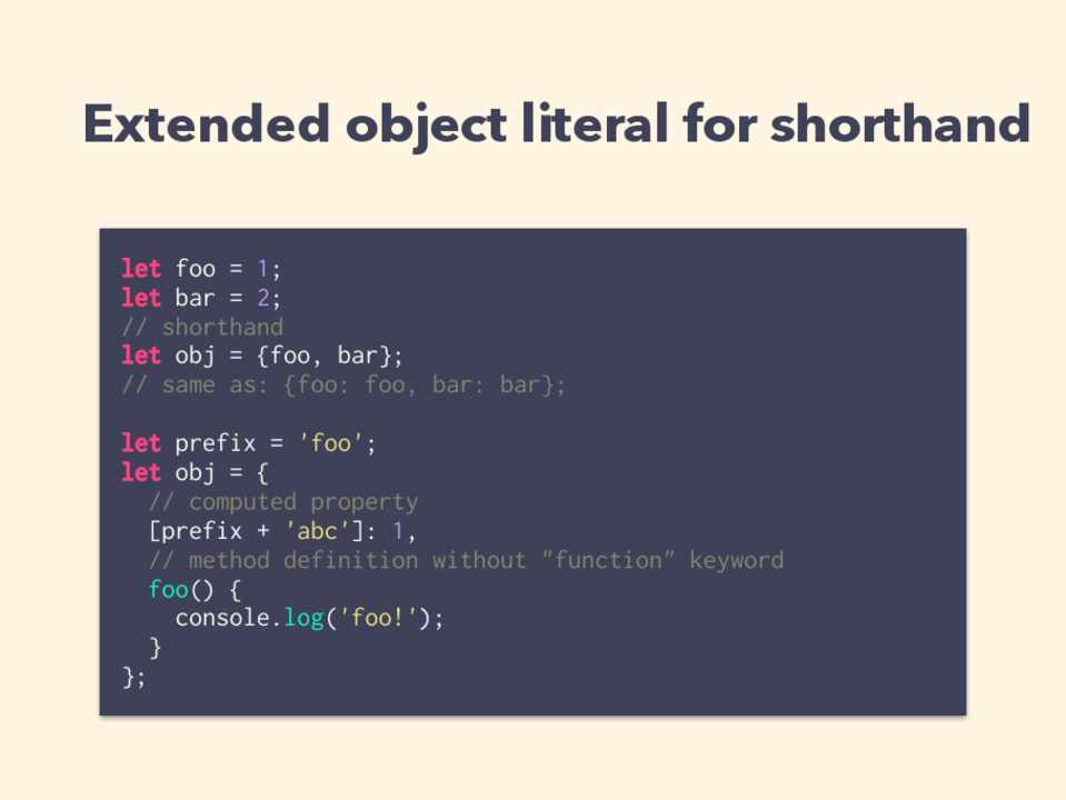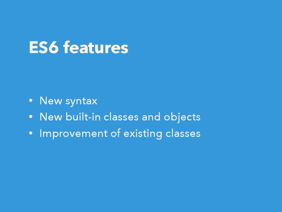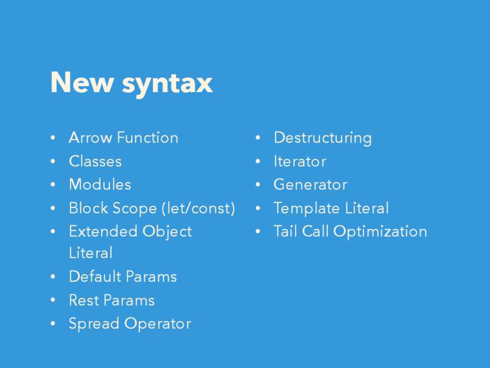 Arrow function, let/const, Extended Object literal, Classes Extended function params, Template literal, Map/Set, Promise…