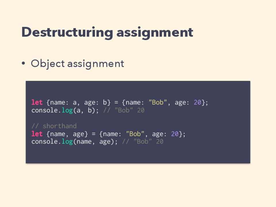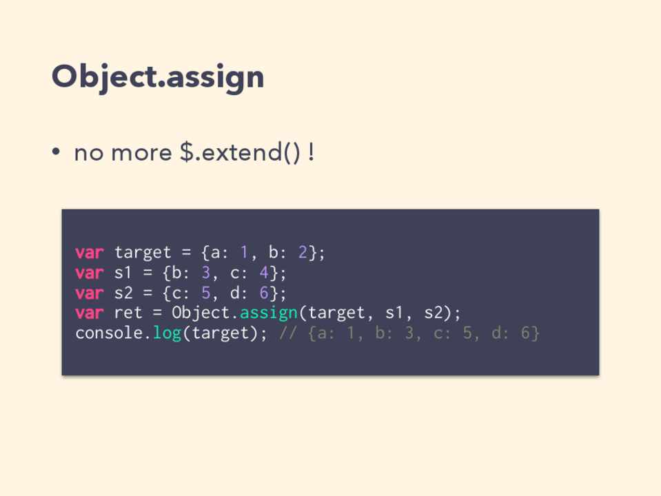 var target = {a: 1, b: 2}; var s1 = {b: 3, c: 4}; var s2 = {c: 5, d: 6}; var ret = Object.assign(target, s1, s2); console.log(target); // {a: 1, b: 3, c: 5, d: 6}