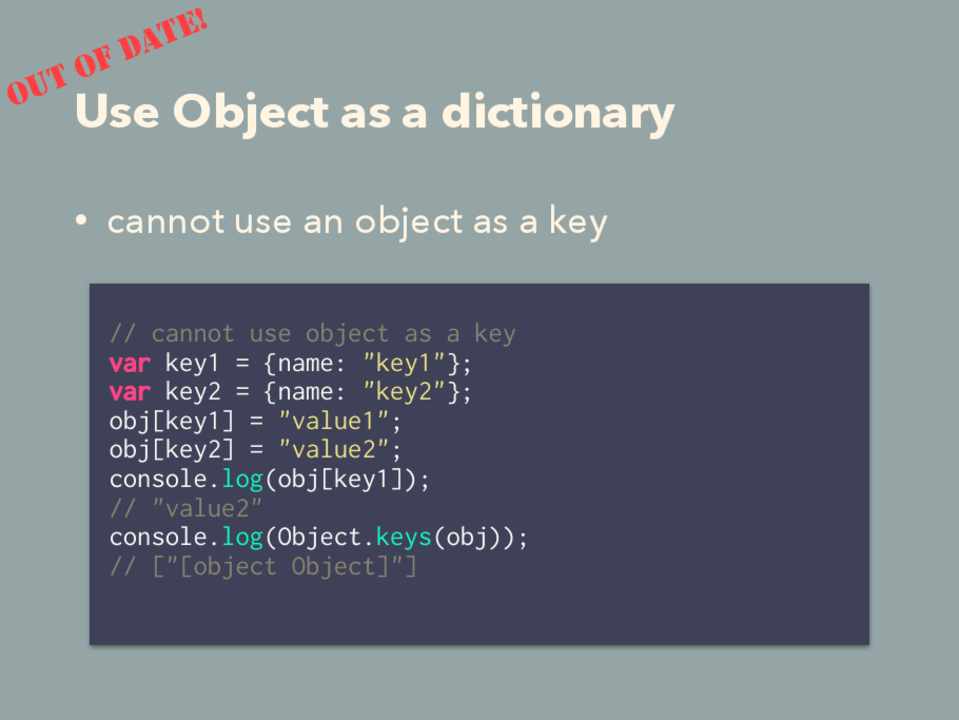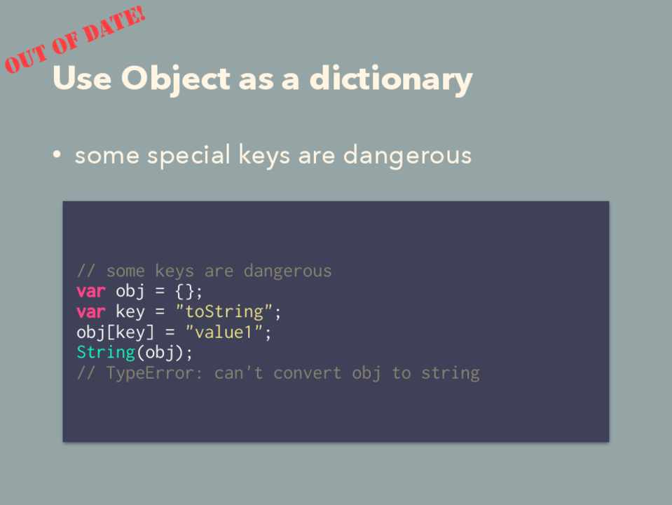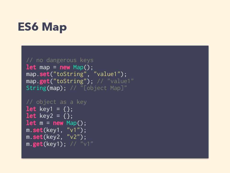 // no dangerous keys let map = new Map(); map.set("toString", "value1"); map.get("toString"); // "value1" String(map); // "[object Map]" // object as a key let key1 = {}; let key2 = {}; let m = new Map(); m.set(key1, "v1"); m.set(key2, "v2"); m.get(key1); // "v1"