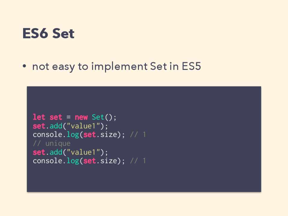 let set = new Set(); set.add("value1"); console.log(set.size); // 1 // unique set.add("value1"); console.log(set.size); // 1