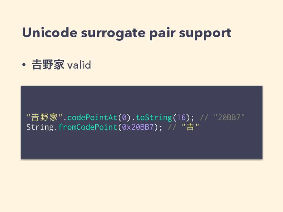"𠮷野家".codePointAt(0).toString(16); // "20BB7" String.fromCodePoint(0x20BB7); // "𠮷"