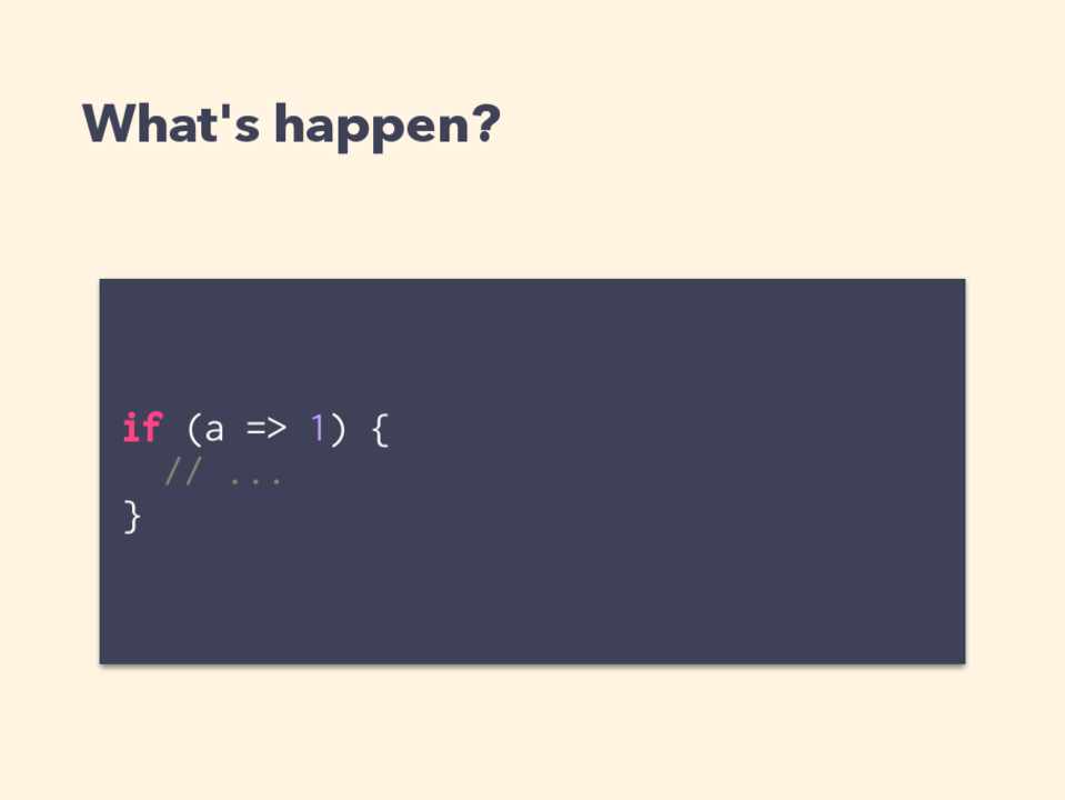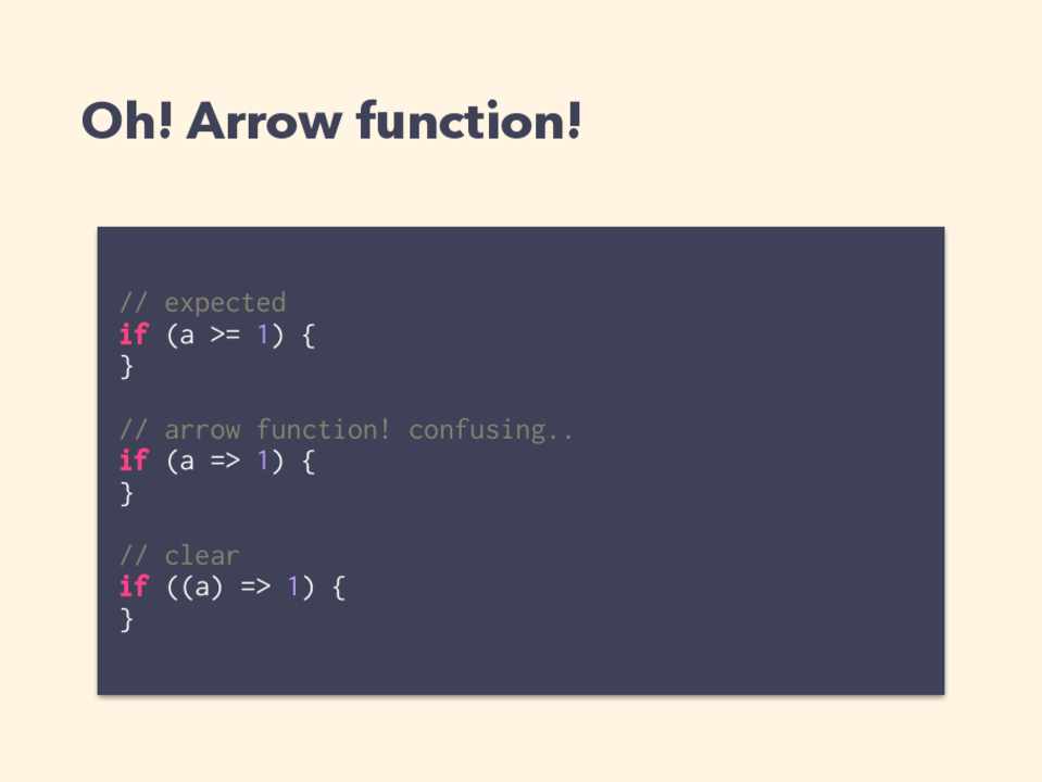 // expected if (a >= 1) { } // arrow function! confusing.. if (a => 1) { } // clear if ((a) => 1) { }