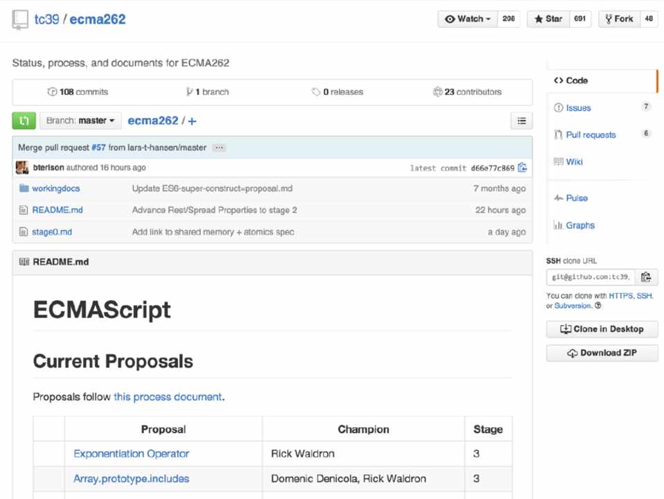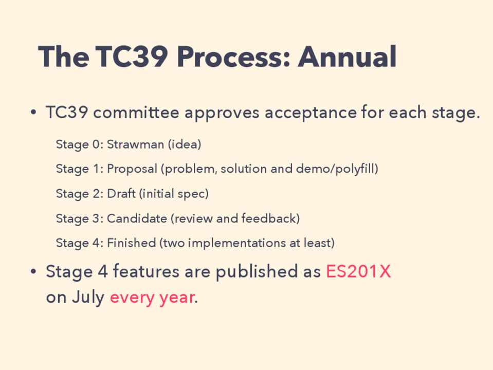 Stage 0: Strawman (idea) Stage 1: Proposal (problem, solution and demo/polyfill) Stage 2: Draft (initial spec) Stage 3: Candidate (review and feedback) Stage 4: Finished (two implementations at least)