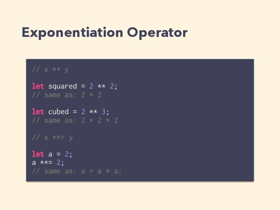 // x ** y let squared = 2 ** 2; // same as: 2 * 2 let cubed = 2 ** 3; // same as: 2 * 2 * 2 // x **= y let a = 2; a **= 2; // same as: a = a * a;