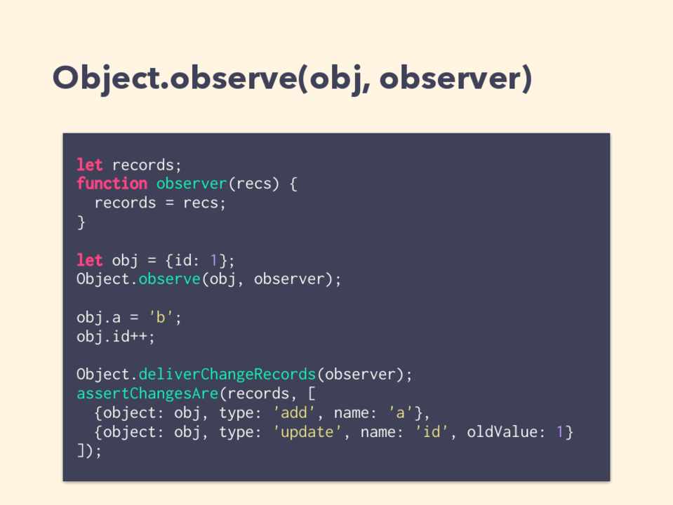 {object: obj, type: 'add', name: 'a'}, {object: obj, type: 'update', name: 'id', oldValue: 1} ]);