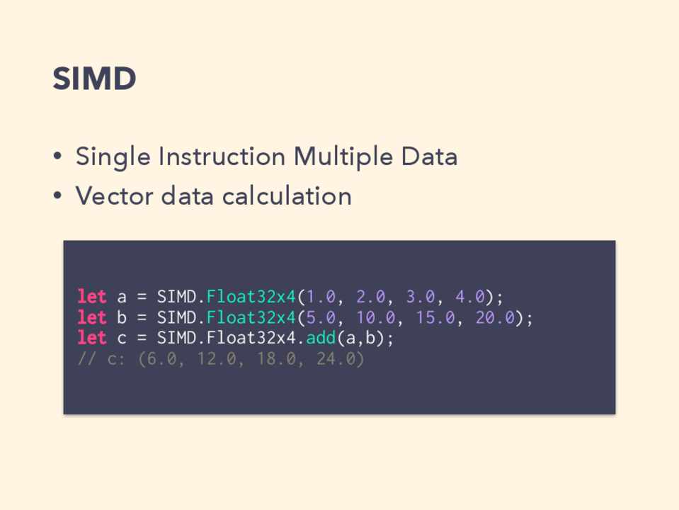let a = SIMD.Float32x4(1.0, 2.0, 3.0, 4.0); let b = SIMD.Float32x4(5.0, 10.0, 15.0, 20.0); let c = SIMD.Float32x4.add(a,b); // c: (6.0, 12.0, 18.0, 24.0)