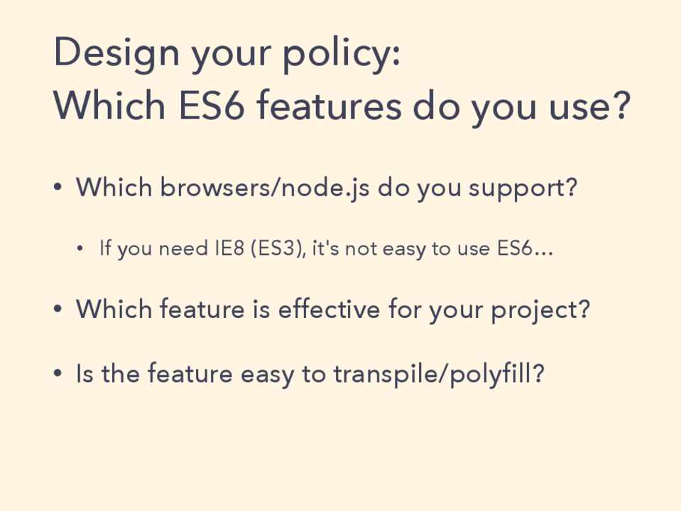 • If you need IE8 (ES3), it's not easy to use ES6…