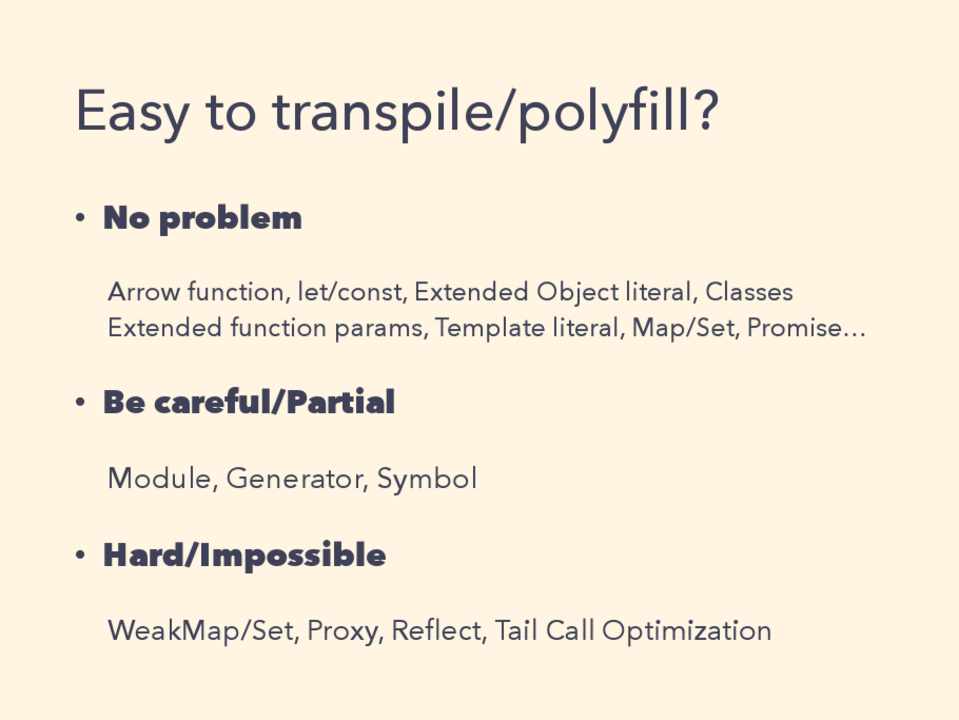 • Which feature is effective for your project? • Is the feature easy to transpile/polyfill?