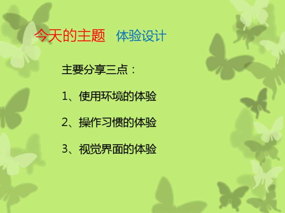 主要分享三点: 1、使用环境的体验 2、操作习惯的体验 3、视觉界面的体验