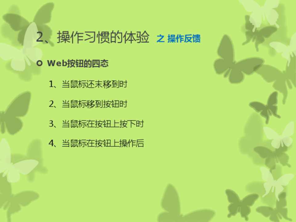 Web按钮的四态 1、当鼠标还末移到时 2、当鼠标移到按钮时 3、当鼠标在按钮上按下时 4、当鼠标在按钮上操作后