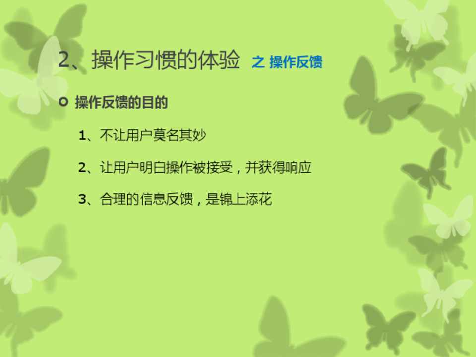 操作反馈的目的 1、不让用户莫名其妙 2、让用户明白操作被接受,并获得响应 3、合理的信息反馈,是锦上添花