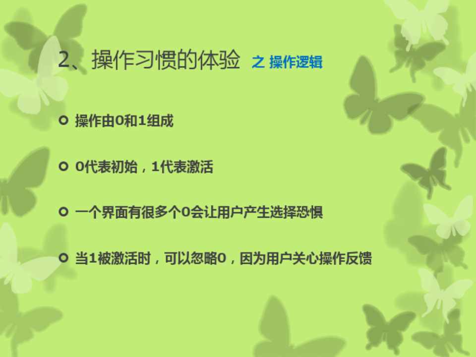 操作由0和1组成 0代表初始,1代表激活 一个界面有很多个0会让用户产生选择恐惧 当1被激活时,可以忽略0,因为用户关心操作反馈