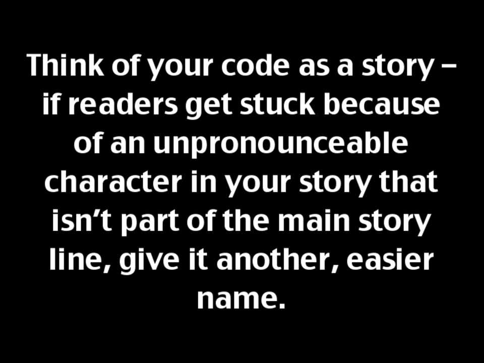 Think of your code as a story – if readers get stuck because of an unpronounceable character in your story that isn’t part of the main story line, give it another, easier name.