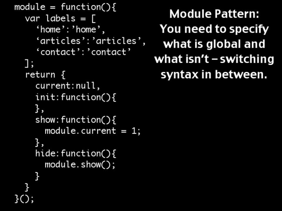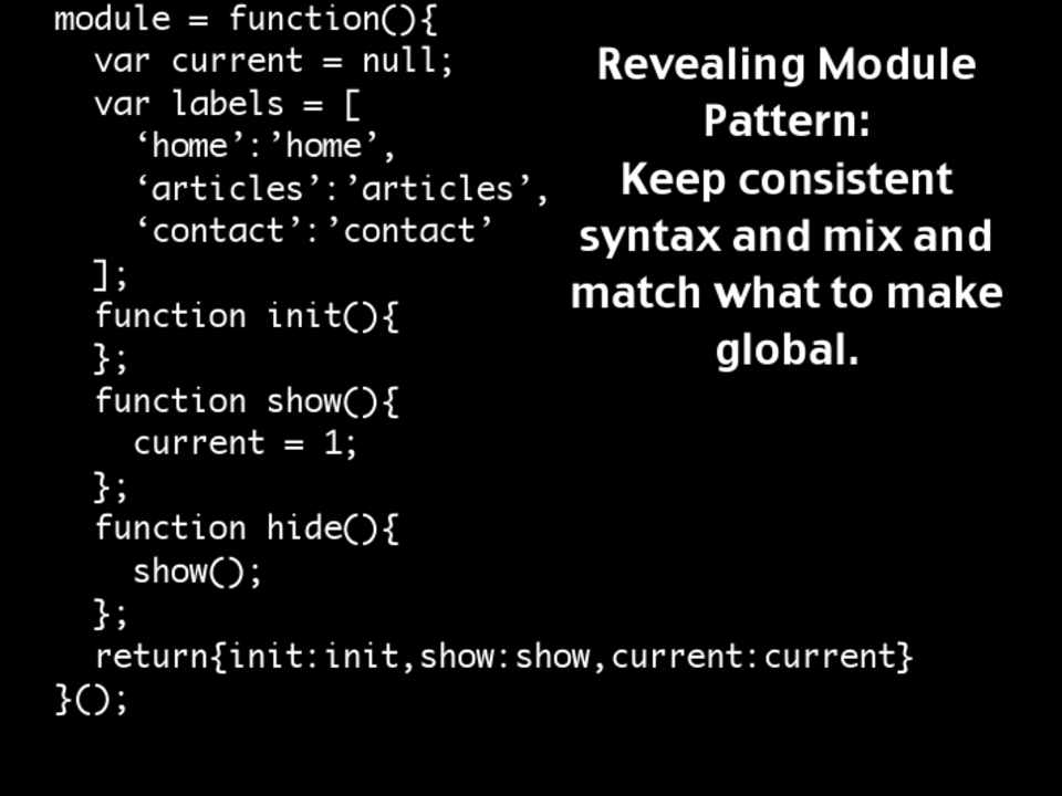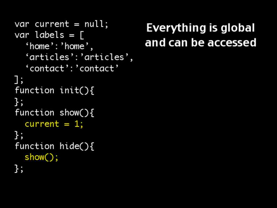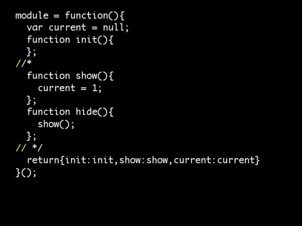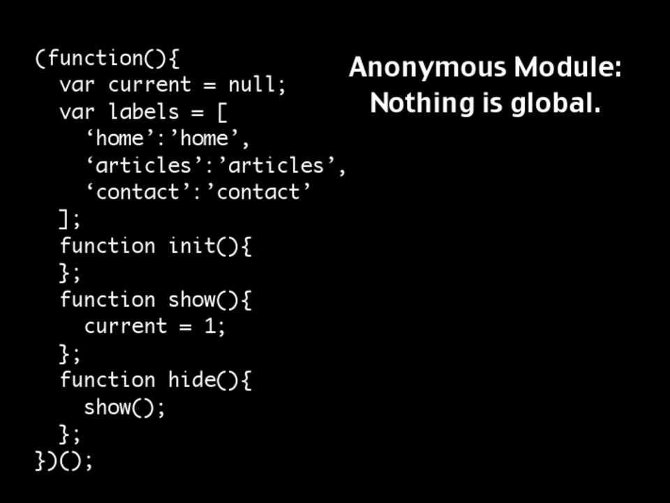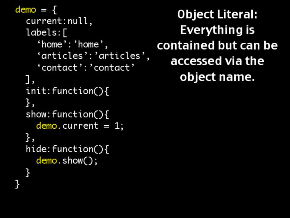 ‘home’:’home’, ‘articles’:’articles’, ‘contact’:’contact’ ]; function init(){ }; function show(){ }; function hide(){ };