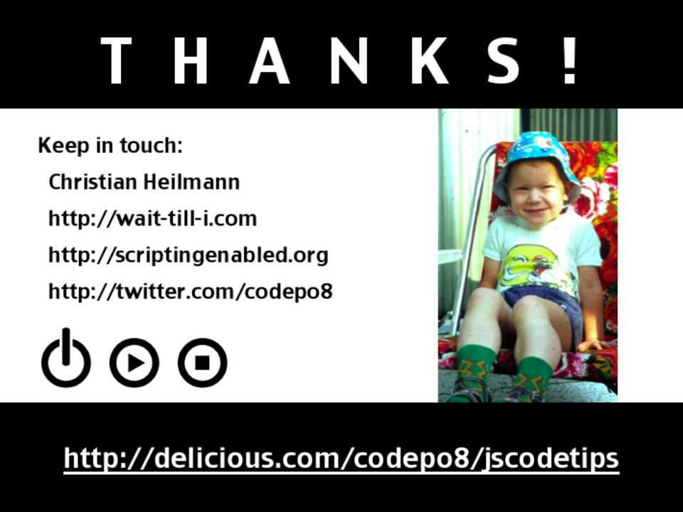 Keep in touch: Christian Heilmann http://wait-till-i.com http://scriptingenabled.org http://twitter.com/codepo8