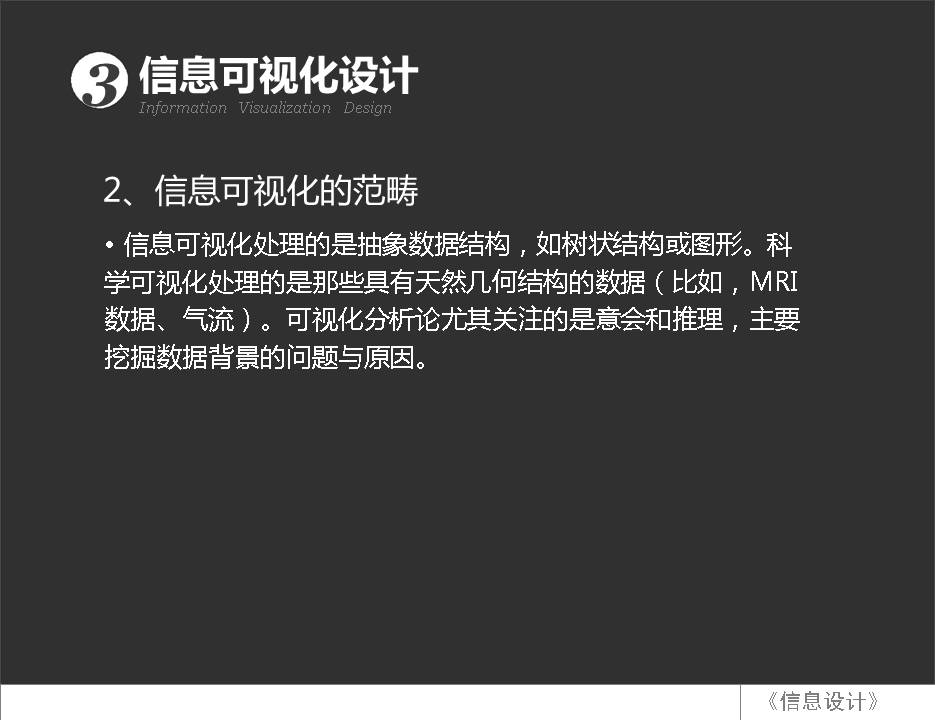 • 信息可视化处理的是抽象数据结构,如树状结构或图形。科学可视化处理的是那些具有天然几何结构的数据(比如,MRI数据、气流)。可视化分析论尤其关注的是意会和推理,主要挖掘数据背景的问题与原因。