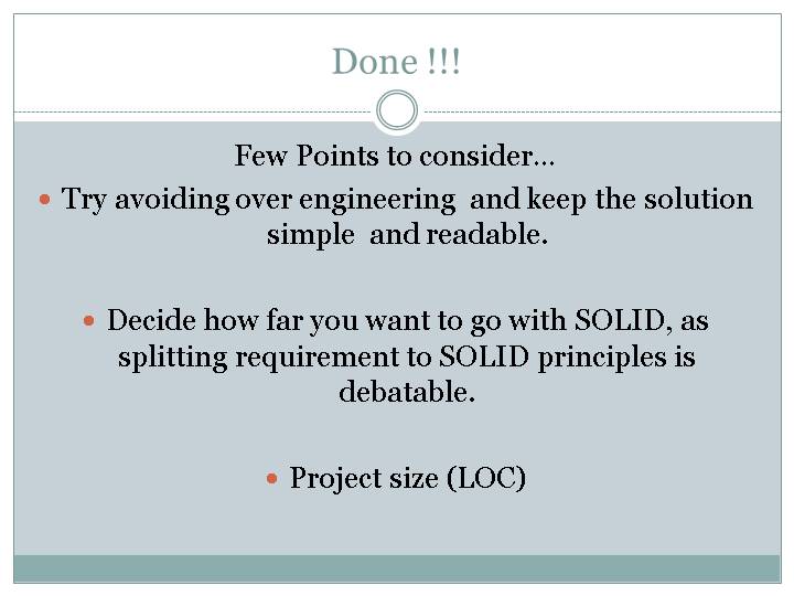 Decide how far you want to go with SOLID, as splitting requirement to SOLID principles is debatable.