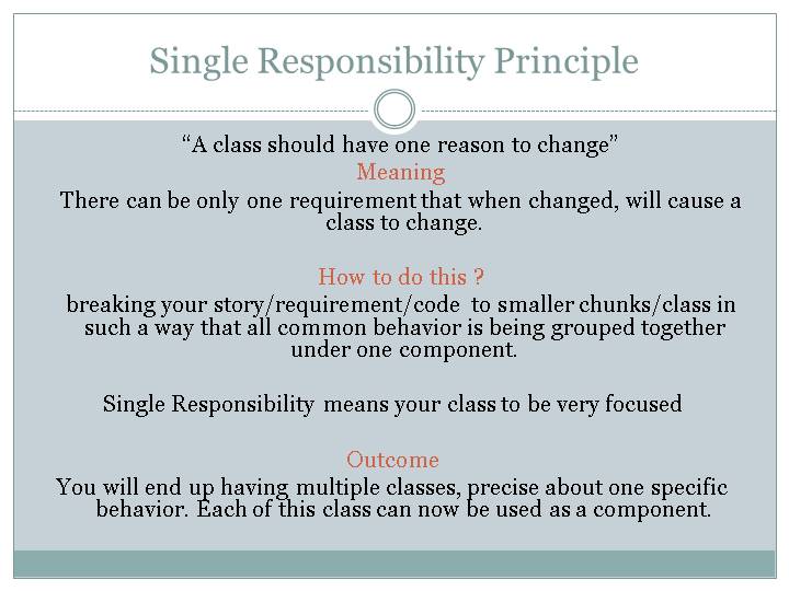 Single Responsibility means your class to be very focused