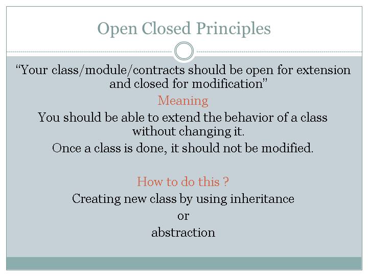 “Your class/module/contracts should be open for extension and closed for modification”