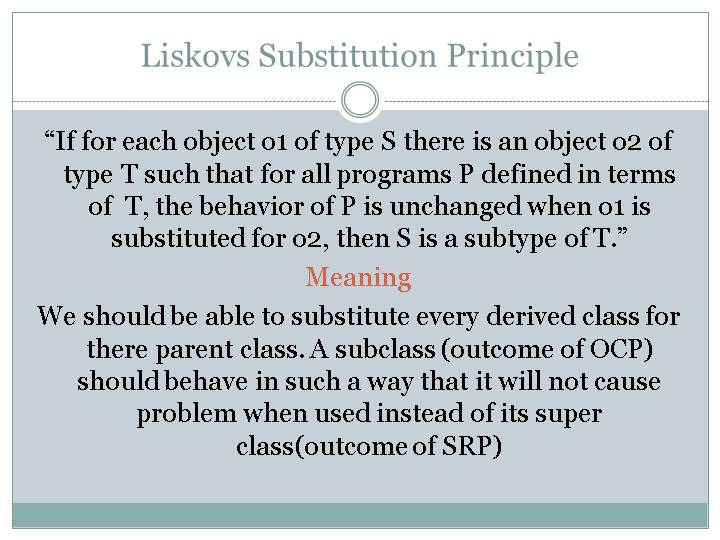 We should be able to substitute every derived class for there parent class. A subclass (outcome of OCP) should behave in such a way that it will not cause problem when used instead of its super class(outcome of SRP)