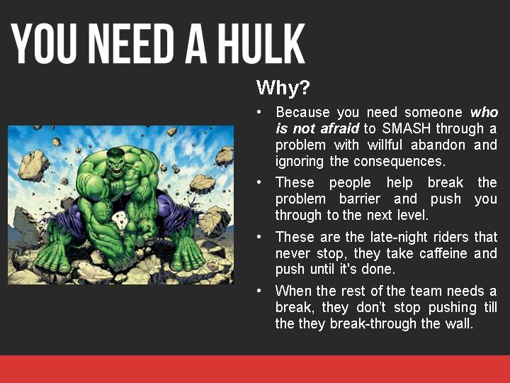 Because you need someone who is not afraid to SMASH through a problem with willful abandon and ignoring the consequences.