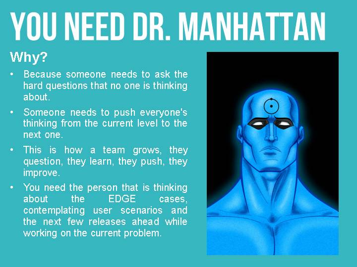 You need the person that is thinking about the EDGE cases, contemplating user scenarios and the next few releases ahead while working on the current problem.