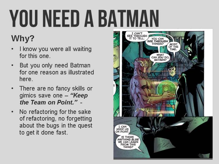 There are no fancy skills or gimics save one – “Keep the Team on Point.” -