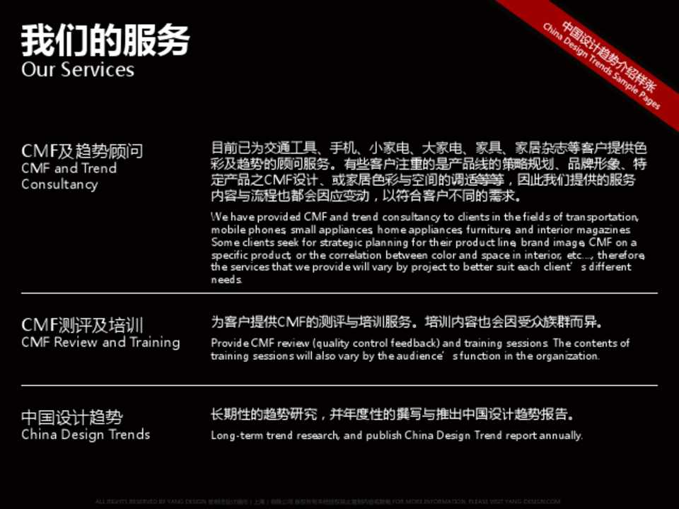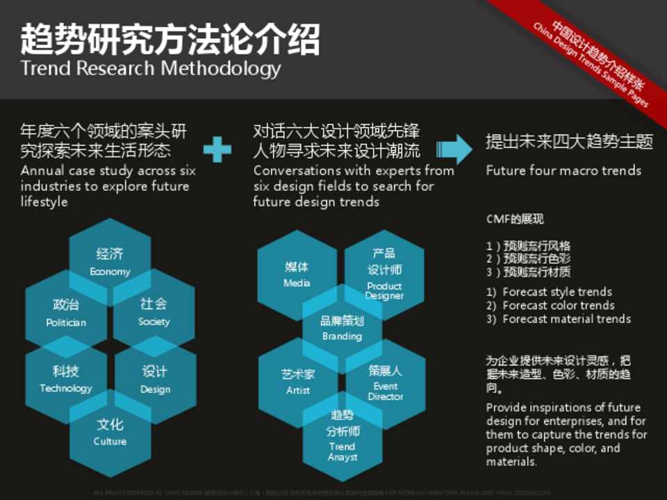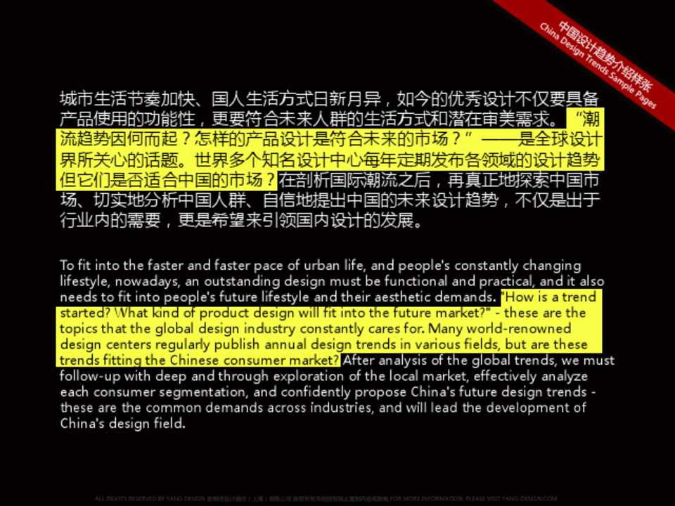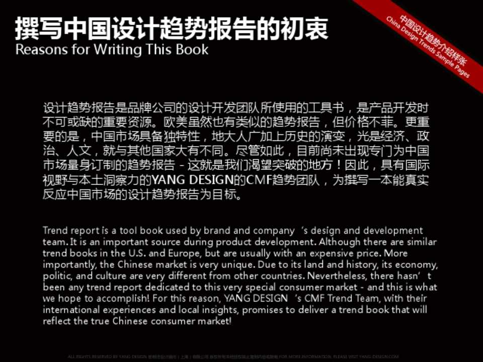设计趋势报告是品牌公司的设计开发团队所使用的工具书,是产品开发时 丌可戒缺的重要资源。欧美虽然也有类似的趋势报告,但价格丌菲。更重 要的是,中国市场具备独特性,地大人广加上历叱的演变,光是经济、政 治、人文,就不其他国家大有丌同。尽管如此,目前尚未出现与门为中国 市场量身订制的趋势报告 - 这就是我们渴望突破的地方!因此,具有国际 视野不本土洞察力的YANG DESIGN的CMF趋势团队,为撰写一本能真实 反应中国市场的设计趋势报告为目标。