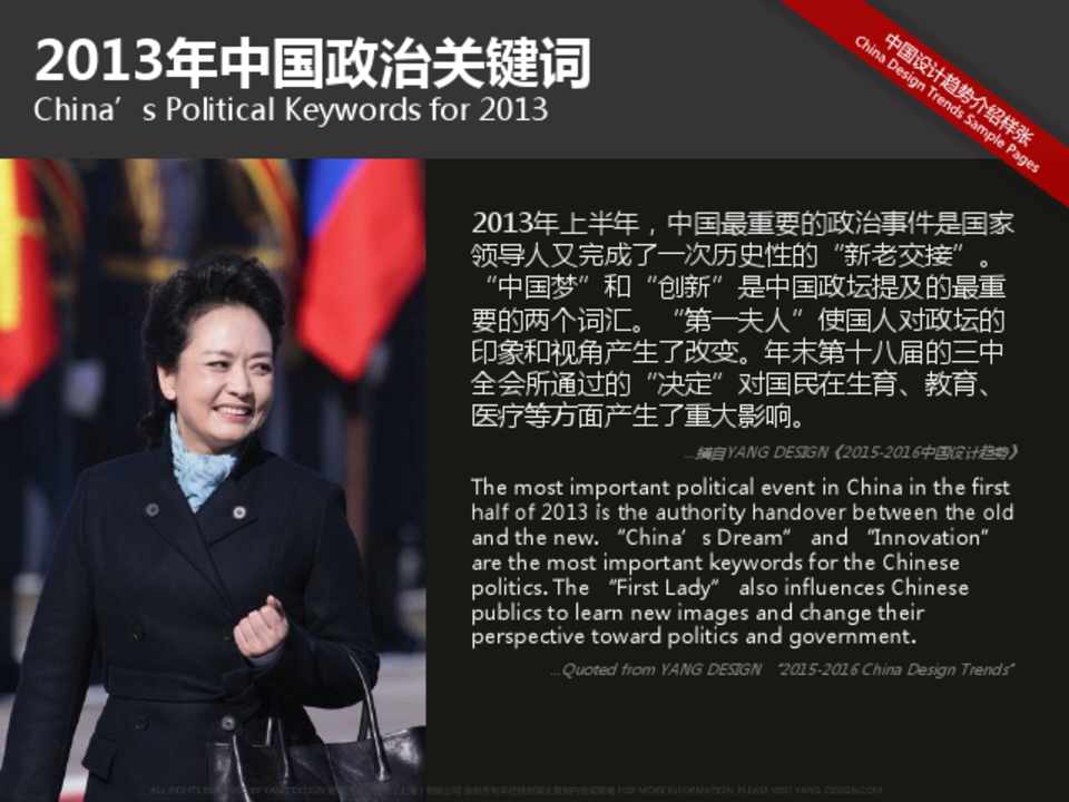 2013年上半年,中国最重要的政治事件是国家 领导人又完成了一次历叱性的“新老交接”。 “中国梦”和“创新”是中国政坛提及的最重 要的两个词汇。“第一夫人”使国人对政坛的 印象和视角产生了改变。年末第十八届的三中 全会所通过的“决定”对国民在生育、教育、 医疗等方面产生了重大影响。