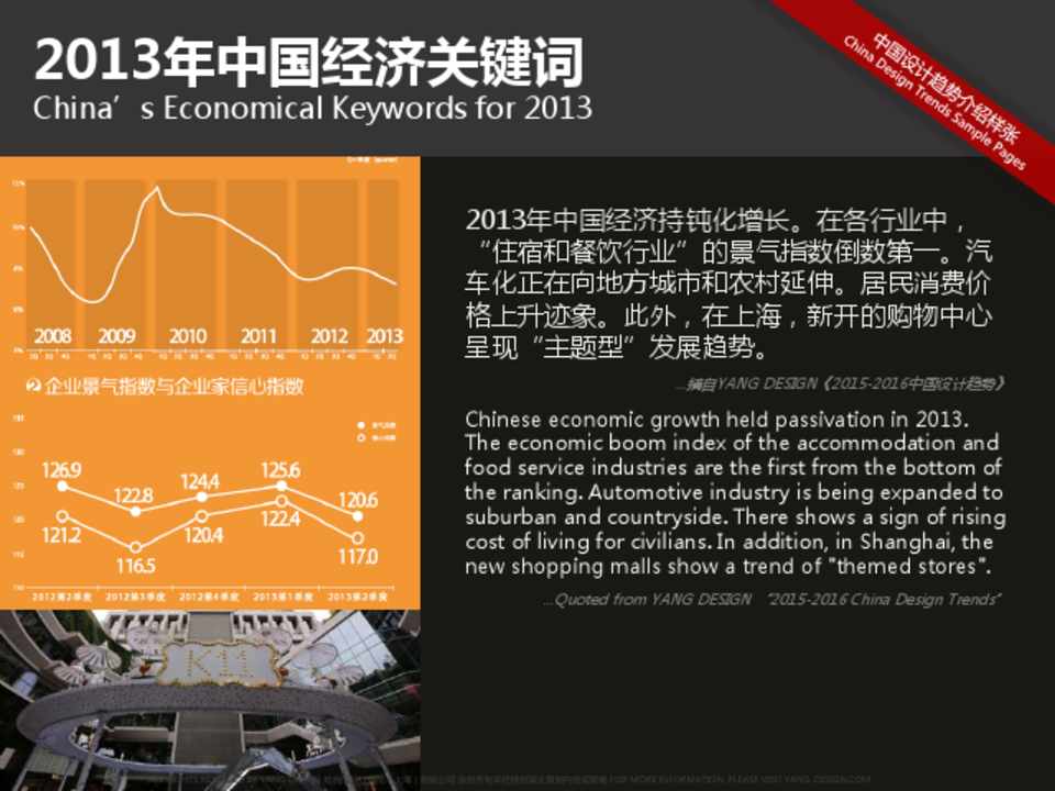 2013年中国经济持钝化增长。在各行业中, “住宿和飠饮行业”的景气指数倒数第一。汽 车化正在向地方城市和农村延伸。居民消费价 格上升迹象。此外,在上海,新开的购物中心 呈现“主题型”发展趋势。